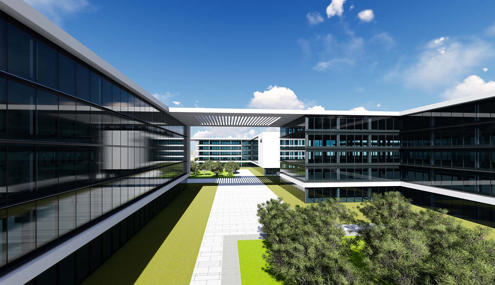以芯片雙核“互聯(lián)互通” 為基礎概念,轉化為建筑空間,形成與世界接軌,和諧五環(huán)的理念。立面上抽象出3D打印機的形態(tài),使建筑具有現(xiàn)代雕塑感。