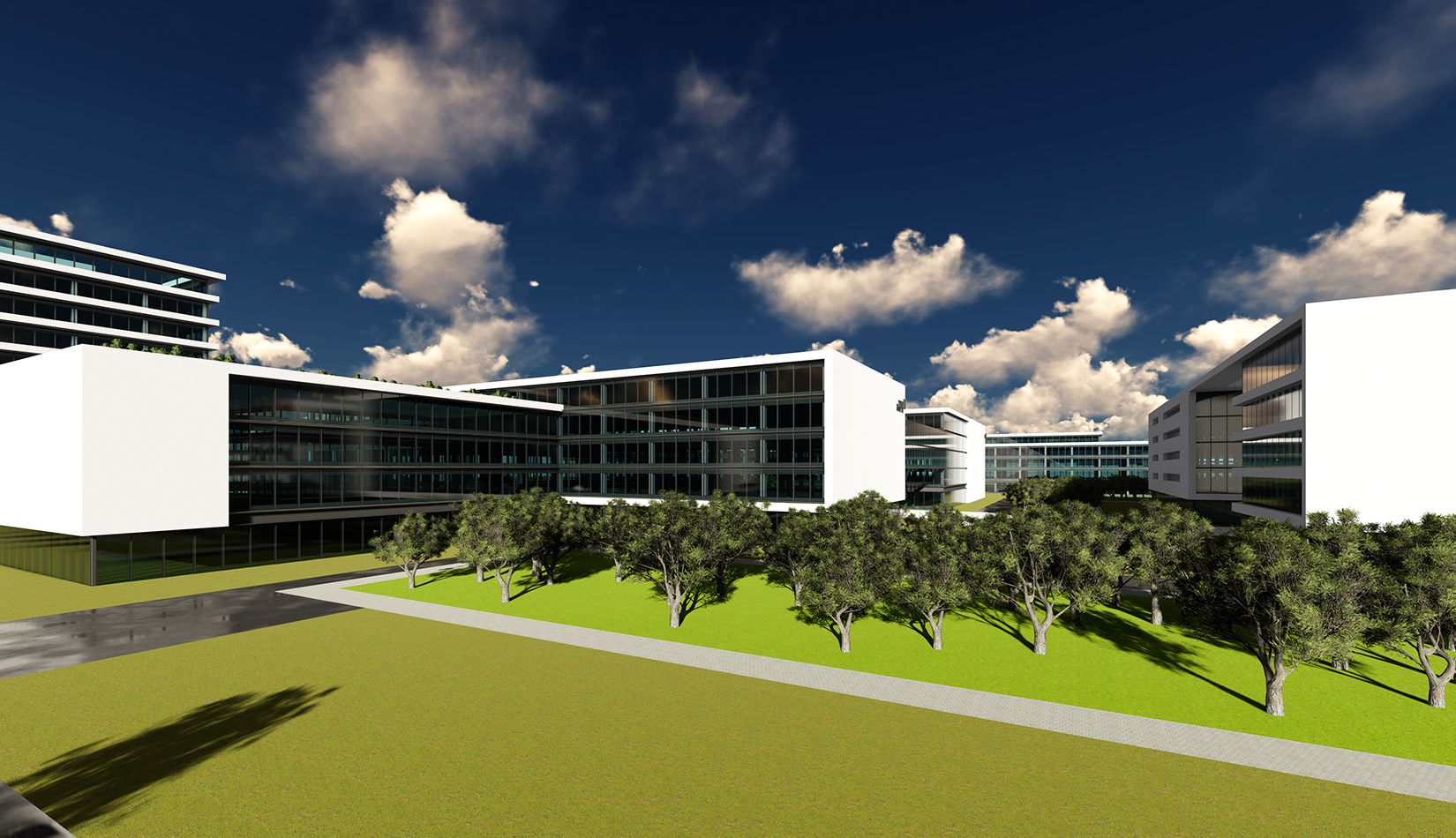用全圍合式布局,形成兩個能量環(huán),為整個園區(qū)輸送無限動力?;盍θh(huán)的自由、靈活的建筑布局形式,為多元化的企業(yè)辦公提供各種空間選擇?;盍θh(huán)均與雙核中心相連,在吸取核心研發(fā)產(chǎn)業(yè)鏈能力同時,不斷提升自己,向雙核中心注入新活力。通過五環(huán)的建筑空間形式,將多元功能塊組合在一起,形成一個共生循環(huán)系統(tǒng)。