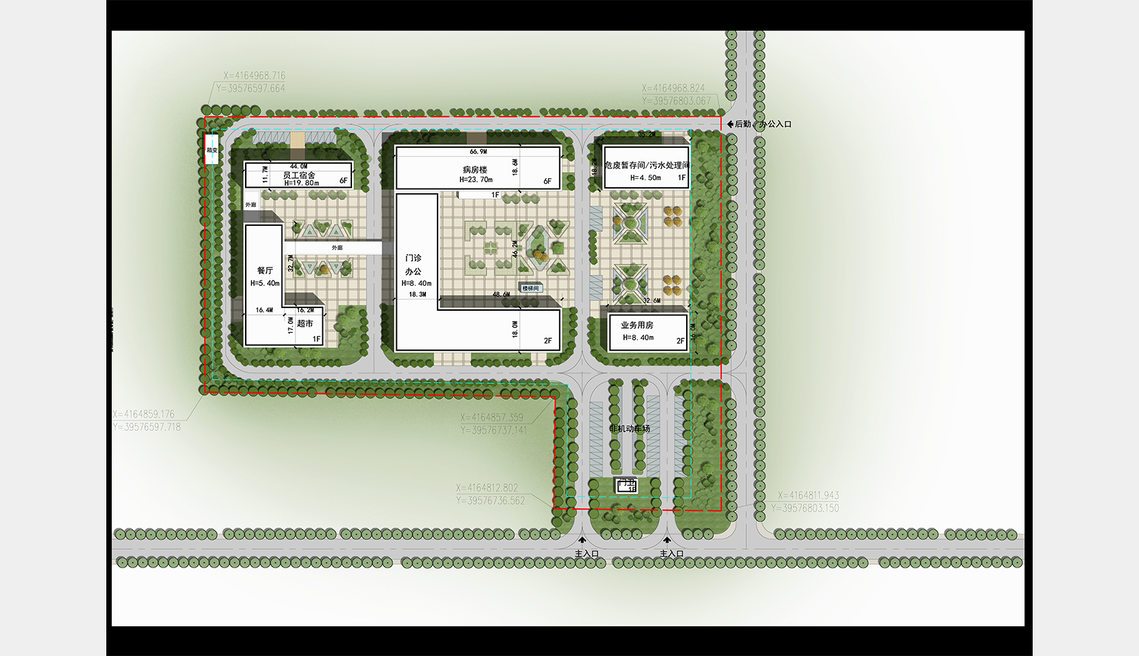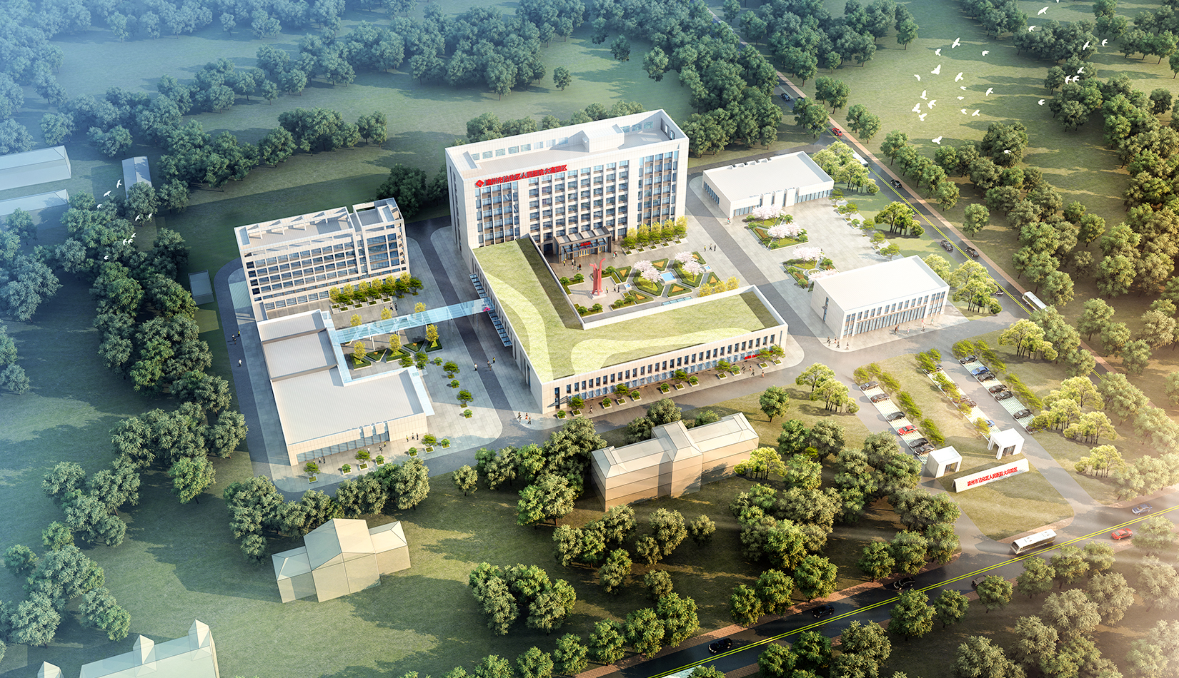 景觀設(shè)計(jì)采用圍合、穿插、滲透等設(shè)計(jì)手法,營造公園式景觀綠化,與建筑群體融合呼應(yīng),打造一個(gè)會(huì)呼吸多元化的綠色醫(yī)院,利用建筑之間的圍合關(guān)系,創(chuàng)造動(dòng)態(tài)的具有生命力的局部景觀。