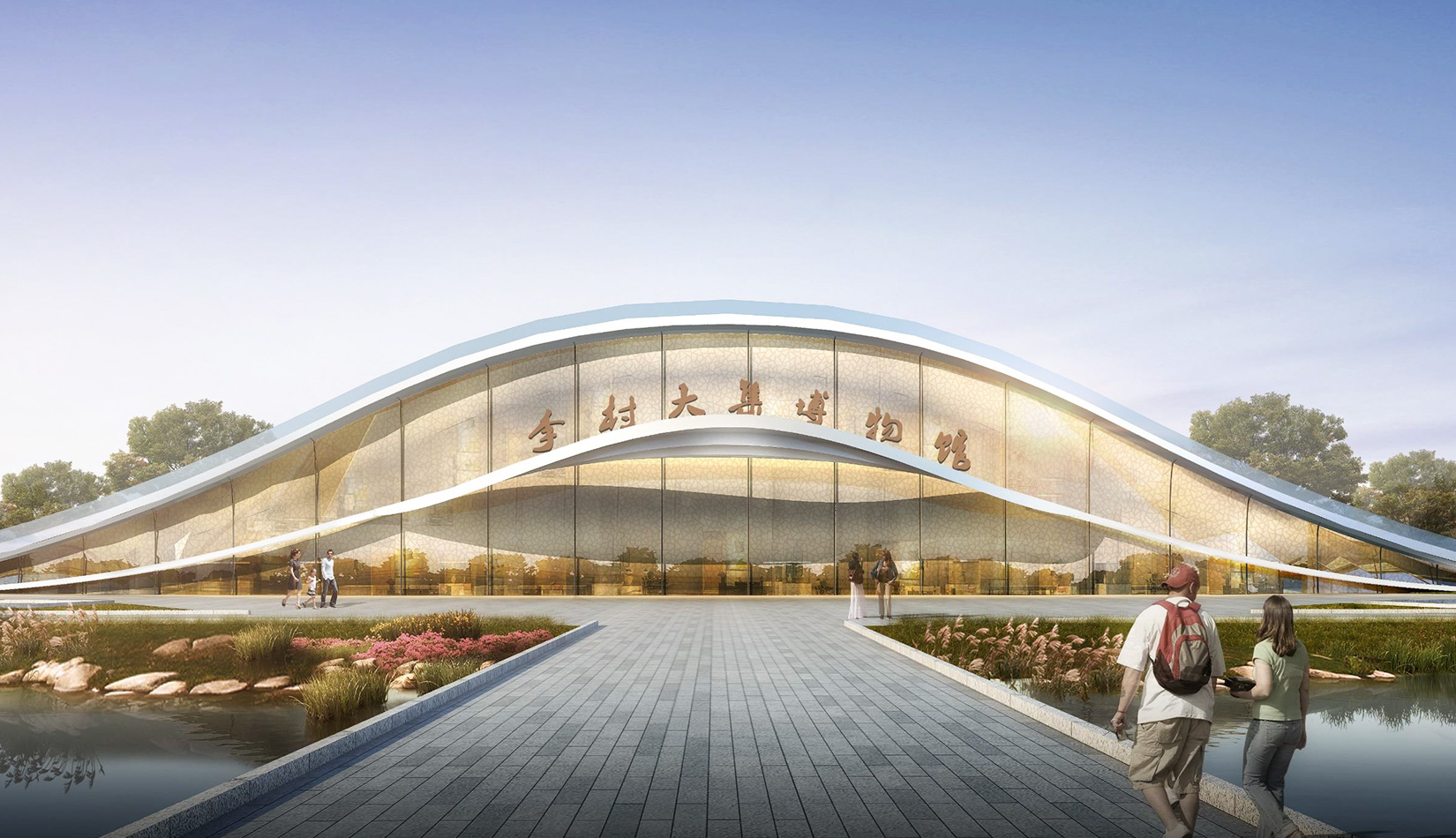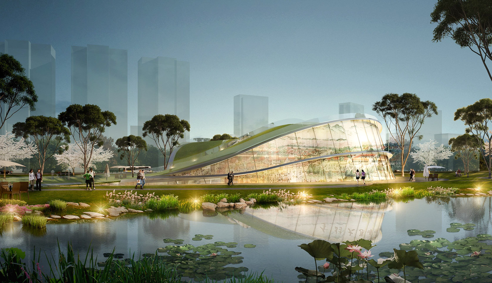 該項(xiàng)目基地位于濱河公園內(nèi),目標(biāo)要將博物館打造成一個(gè)生態(tài)建筑,建筑能與環(huán)境有機(jī)融合。在這一理念下,將博物館設(shè)計(jì)為樹(shù)葉形,建筑猶如一片樹(shù)葉飄落在公園內(nèi),以此體現(xiàn)建筑與環(huán)境的融合。將樹(shù)葉形建筑設(shè)計(jì)為覆土建筑,最大程度還原基地一片綠色,以此呼應(yīng)李村大集的“還原”內(nèi)涵。通過(guò)設(shè)計(jì)兩個(gè)曲線形體相互交融形成建筑的最終體量,以此體現(xiàn)相逢意蘊(yùn),呼應(yīng)李村大集的“相逢”內(nèi)涵。
