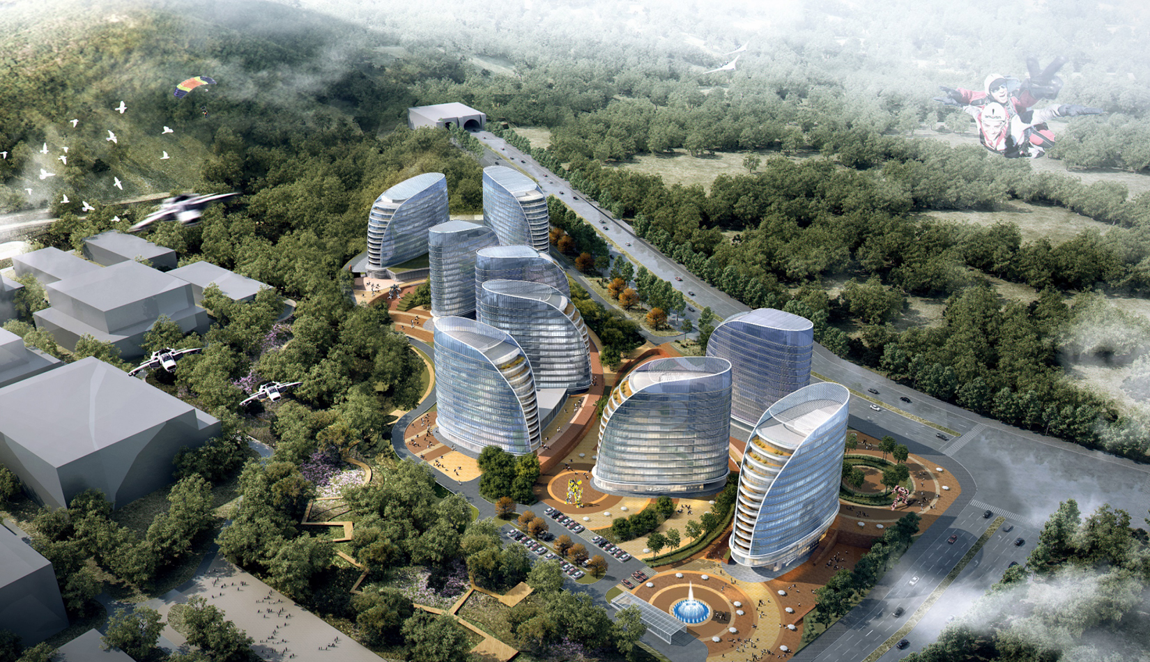 注重地塊內(nèi)空間環(huán)境的滲透和景觀視線效果,保持地塊環(huán)境與城市環(huán)境的共融性,提升城市空間價值。建筑外觀采用簡潔、現(xiàn)代的風格,立面形象富有視覺沖擊力,樹立企業(yè)品牌與形象。高層建筑層層平臺向景觀蔓延,為人們提供豐富多變的生活工作空間。底層平臺上的文化內(nèi)街,結(jié)合影視特色主題,聚集人氣,串聯(lián)互動。曲線連廊內(nèi)部空間流動,成為具有活力的公共交往場所。