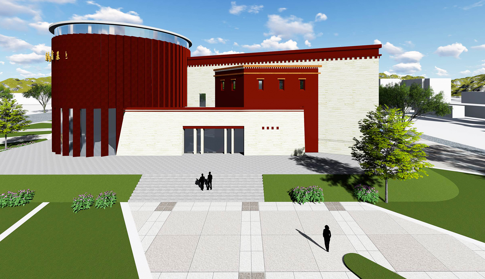 設計造型整體為中心聚攏的形態(tài),圓形體塊是建筑的核心,象征著黨的領導,各分支體塊象征著分布在果洛的各個民族,體現(xiàn)出各民族團結一心,同心向黨,在黨的領導下團結一致、共同奮斗;另一方面,圓形體塊與各分支體塊的簇擁關系也象征著各民族緊密團結,永不分離。