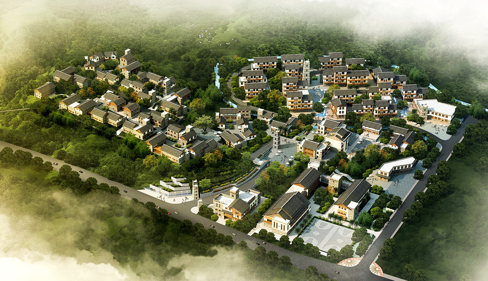 建筑布局依山就勢,充分結(jié)合自然地形地貌,建筑體量與周邊環(huán)境和諧相融的生態(tài)型城鎮(zhèn);