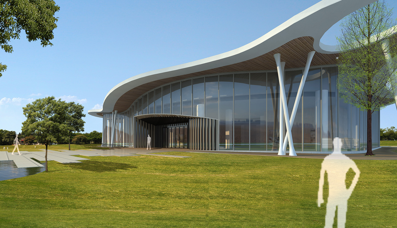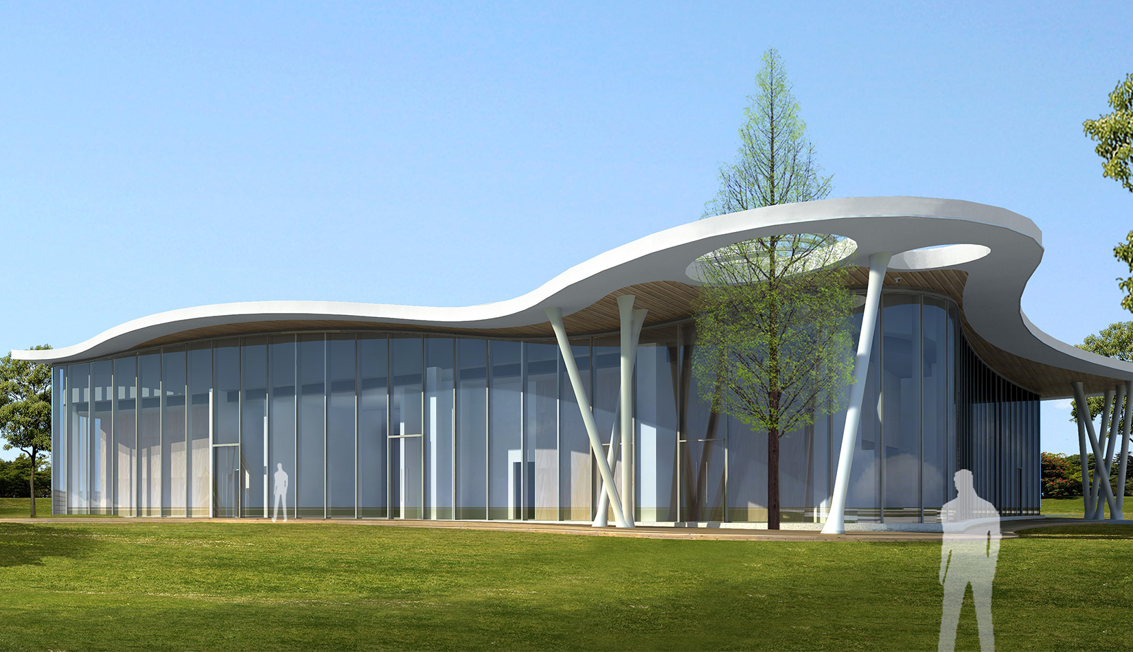 該項(xiàng)目以“森林中的小屋”為理念,通過(guò)“自由流水形態(tài)的木質(zhì)屋頂加純凈的玻璃幕墻”的組合,從而達(dá)到建筑與自然的共生,使得建筑真正的融合于自然風(fēng)景之中。設(shè)計(jì)師將節(jié)能、